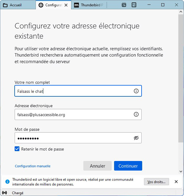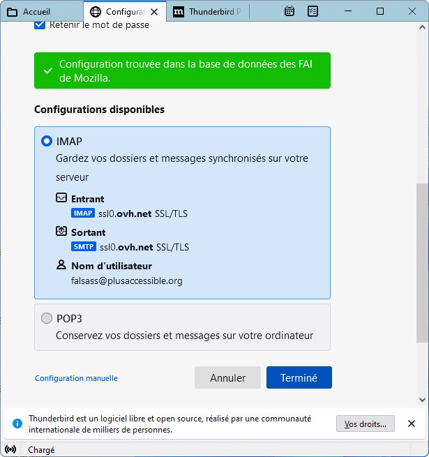 La plupart du temps, Thunderbird trouvera les données pour compléter la configuration. Si ce n'est pas le cas, il faudra