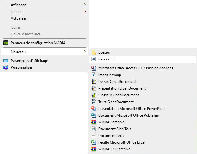 Les raccourcis Pour les sites que vous fréquentez très régulièrement, il existe un moyen encore plus rapide d'y accéder. Il consiste à créer un raccourci sur le bureau. Cela se fait très simplement : clic droit sur le bureau, sélection Nouveau Raccouci :
