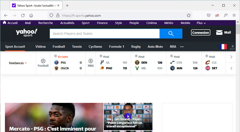 ce qui peut très bien vous convenir si vous y possédez une adresse mail. Vous pouvez même, si le coeur vous en dit, démarrer sur la page Yahoo! sport. Un portail généraliste, c'est pratique, mais ça ne conviendra pas à ceux d'entre vous qui préfèrent être libres de leurs choix et être orientés le moins possible. Ceux-là préféreront sans doute démarrer sur une page neutre proposant seulement un moteur de recherche, c'est ce qu'on va voir maintenant. Exercice suivant. |