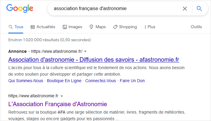 C'est celui que nous allons privilégier pour les exercices. Mais si vous voulez en tester d'autres, des liens figurent en bas de cette page. Le fonctionnement d'un moteur de recherche est simplissime. On saisit les mots clés les plus judicieux possible et le moteur propose des adresses sous forme de liens hypertextes. Ces liens sont agrémentés de parties de texte ou d'images issues des sites proposés afin de vous éclairer dans vos choix. Exemples : Recherche du site de l'AFA :
