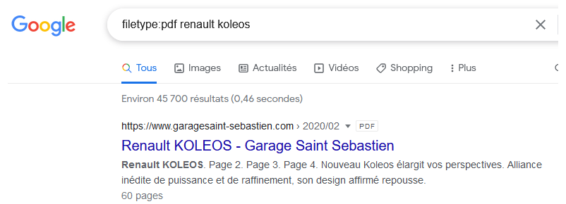 Le mot filetype: : Ce terme vous permet de filtrer les réponses en indiquant un type de ressources particulier. Par exemple, si vous cherchez des notices, il est judicieux de sélectionner uniquement les liens vers des fichiers PDF :