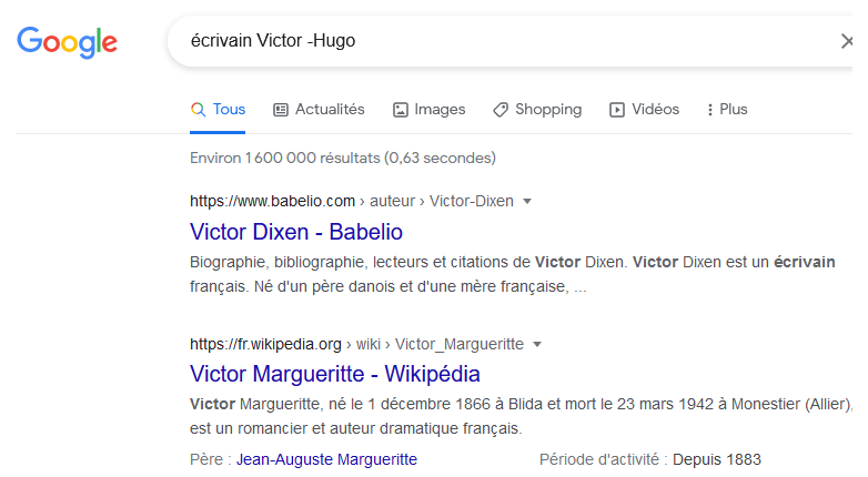 Le signe moins - : Le signe moins sert à exclure un ou plusieurs mots de la recherche. Prenons un exemple : vous cherchez le nom d'un écrivain dont vous ne vous rappelez que le prénom, Victor. Si vous faites une recherche avec les mots écrivain Victor, il y a des chances que vous soyez noyé sous les réponses concernant Victor Hugo. Dans ce cas, il suffit d'exclure Hugo de la requête :