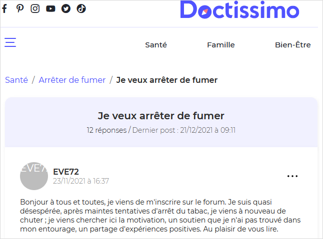 Évidemment, ce concept a été repris sur le Web dès son origine et le nombre de forums n'a cessé de croître depuis. Parler de tout et de rien, poser des questions à des gens compétents dans tel ou tel domaine, rencontrer et échanger avec des personnes qui partagent la même passion que vous, le forum est l'endroit idéal pour dialoguer, questionner, se dépanner et dépanner les autres, et aussi parfois hélas, pour s'invectiver. Vous pouvez tomber sur un forum par hasard, noyé dans la multitude de réponses de votre moteur de recherche, mais vous pouvez aussi lui forcer la main en rajoutant de mot-clé forum dans votre recherche. Il y en a de très connus et très fréquentés comme celui de Doctissimo :