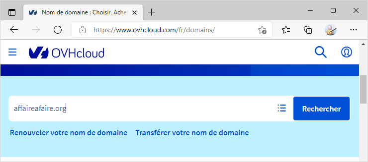 Créer un site : Le domaine Il pourrait bien se trouver, malgré les nombreuses possibilités offertes par ce qu'il est donc convenu d'appeler le Web 2.0, que vous vouliez publier sur le Web par vos propres moyens et qu'aucune des solutions parmi celles que nous venons de passer en revue ne vous convienne. Dans ce cas, il faut retrousser vos manches et devenir votre propre éditeur sur le Web. Par exemple, vous voulez créer un site où les membres d'une association dont vous faites partie proposent aux autres membres ainsi qu'aux visiteurs ce qu'ils pensent être de bonnes affaires. Est-ce si compliqué que ça ? À vous de juger au vu de cette simulation : Première étape : Trouver un nom pour le site. Affaires à faire semble vous convenir. Très bien. Il va falloir maintenant trouver un endroit pour héberger les pages du site. Pour ça, vous avez deux solutions : Utiliser un hébergement gratuit qui peut être les pages perso proposées par votre fournisseur d'accès à Internet (provider en anglais) ou bien trouver un hébergeur qui nous fournira de l'espace sur ses serveurs pour y placer les fichiers du site et qui, en même temps, nous attribuera un nom de domaine. Si vous préférez ne pas avoir à acheter un nom de domaine, ni à payer un hébergement, vous allez opter pour la première solution. Vous allez donc obtenir une adresse du type http://affairesafaire.monprovider.com/. L'adresse ne sera pas très facile à retenir pour les visiteurs, et les services proposés seront moindres que chez un hébergeur professionnel. Mais cela peut suffire. Si vous optez pour un hébergeur professionnel, il va falloir trouver un nom de domaine adéquat. Le nom affairesafaire.org semble convenir, reste à savoir s'il n'a pas déjà été utilisé par quelqu'un d'autre. Deuxième étape : Si vous n'avez pas opté pour les pages perso, il vous faut trouver un hébergeur qui nous fournira de l'espace sur ses serveurs pour y placer les pages du site et qui en même temps nous attribuera le nom de domaine affairesafaire.org.OVH est sans doute un bon choix :