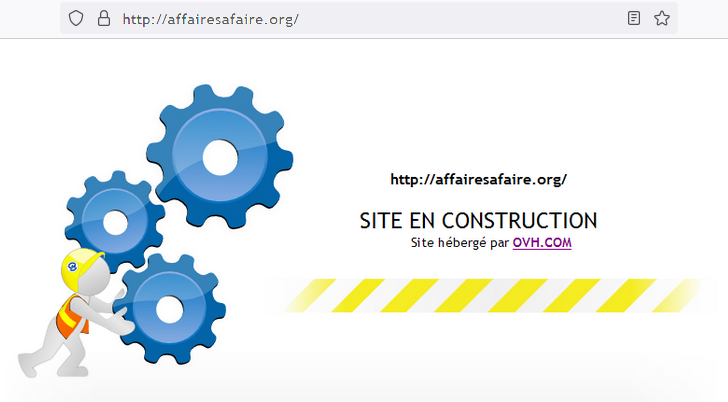 Par chance, le nom de domaine est disponible. Quelques clics plus tard, après vous être enregistré comme client d'OVH et avoir réglé la somme de quelques dizaines d'euros pour l'année, vous voilà propriétaire du nom de domaine et d'un espace qui se compte en centaines de Giga-octets incluant les modules Wordpress et Joomla, plus la possibilité de créer des comptes e-mails et de gérer une base de données. Quelques heures plus tard, vous pouvez saisir l'URL http://affairesafaire.org dans votre navigateur et découvrir votre site :